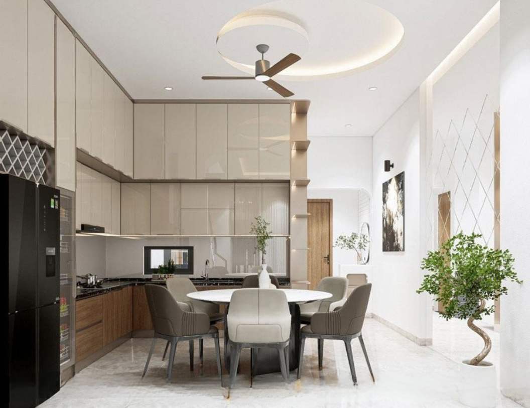 Mẫu tủ bếp Acrylic chữ L này gây ấn tượng với sự hòa quyện giữa màu be bóng gương và vân gỗ nâu. Sự kết hợp tinh tế này vừa hiện đại, vừa mang hơi thở tự nhiên, giúp không gian bếp trở nên hài hòa. Nhà Bếp Việt lựa chọn phối màu này để phù hợp xu hướng và gu thẩm mỹ đa dạng của khách hàng.